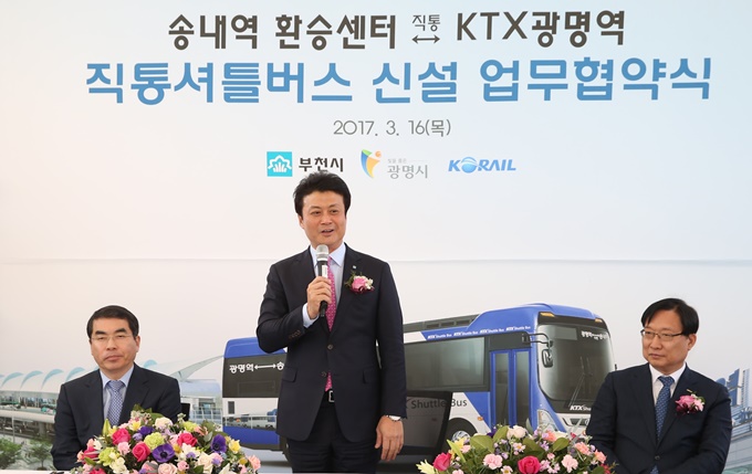±è¸¸¼ö ºÎõ½ÃÀåÀÌ 16ÀÏ ¿ÀÈÄ 3½Ã30ºÐ ¼Û³»¿ª ȯ½Â¼¾ÅÍ 2Ãþ¿¡¼­ ºÎõ ¼Û³»¿ª ȯ½Â¼¾ÅÍ¿¡¼­ KTX ±¤¸í¿ª±îÁö ¿îÇàÇÏ´Â Á÷Åë ¼ÅÆ²¹ö½º ½Å¼³ ¾÷¹«Çù¾à½Ä¿¡¼­ Àλ縻À» Çϰí ÀÖ´Ù. 2017.3.16