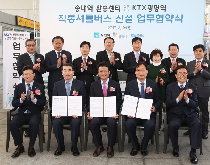 ±è¸¸¼ö ºÎõ½ÃÀå(°¡¿îµ¥), ¾ç±â´ë ±¤¸í½ÃÀå(¿ÞÂÊ), È«¼ø¸¸ ÄÚ·¹ÀÏ »çÀå(¿À¸¥ÂÊ)ÀÌ 16ÀÏ ¿ÀÈÄ 3½Ã30ºÐ ¼Û³»¿ª ȯ½Â¼¾ÅÍ 2Ãþ¿¡¼­ ºÎõ ¼Û³»¿ª ȯ½Â¼¾ÅÍ¿¡¼­ KTX ±¤¸í¿ª±îÁö ¿îÇàÇÏ´Â Á÷Åë ¼ÅÆ²¹ö½º ½Å¼³ ¾÷¹«Çù¾àÀ» ü°áÇÏ°í ±â³äÃÔ¿µÀ» Çϰí ÀÖ´Ù. 2017.3.16