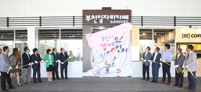 ½Ã ÀÏÀÚ¸®°æÁ¦°ú ÀÏÀÚ¸®Áö¿øÆÀ¿¡ µû¸£¸é ¡®ºÎõÀÏÀÚ¸® Ä«Æä¡¯ °³¼Ò½Ä¿¡´Â ÀåÇö¼® °í¿ë³ëµ¿ºÎ ºÎõÁöûÀå°ú ¼­Áø¿õ °æ±âµµÀÇ¿ø(ºÎõ4), ¹Î¸ÍÈ£(ºÎÀÇÀå)¤ýÇѼ±Àç¤ý¹æÃáÇϤý¹Úº´±Ç¤ýÁ¤ÀçÇö ºÎõ½ÃÀÇ¿ø, ÀÌ¿ë¿ì ºÎõ½Ã ÀÏÀÚ¸®°æÁ¦°úÀå, ¢ßÀ¯º£À̽º °ü°èÀÚ µî 30¿© ¸íÀÌ Âü¼®ÇØ ÇöÆÇ Á¦¸·½ÄÀ» °¡Á³´Ù.
