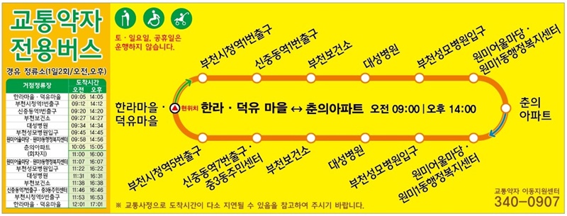 ±³Åë¾àÀÚ Àü¿ë¹ö½º´Â ÇѶó¸¶À»¤ý´öÀ¯¸¶À»À» ±âÁ¡À¸·Î ºÎõ½Ãû~ ½ÅÁßµ¿¿ª~ ºÎõ½Ã º¸°Ç¼Ò~ ´ë¼ºº´¿ø~ ¼º¸ðº´¿ø~ ¿ø¹Ì¾î¿ï¸¶´çÀ» °ÅÃÄ È¸Â÷ÁöÀÎ ÃáÀÇÁÖ°ø¾ÆÆÄÆ® ±¸°£À» ÇÏ·ç µÎ Â÷·Ê¾¿ ¿îÇàÇÑ´Ù. ¿îÇà½Ã°£Àº ÆòÀÏ ¿ÀÀü 9½Ã¿Í ¿ÀÈÄ 2½Ã·Î, ÁÖ¸»°ú °øÈÞÀÏÀº ¿îÇàÇÏÁö ¾Ê´Â´Ù.