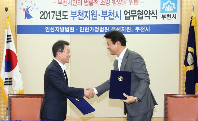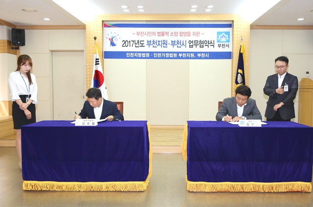 ±è¼öÀÏ ÀÎõÁö¹ý ºÎõÁö¿øÀå(¿ÞÂÊ)°ú ±è¸¸¼ö ºÎõ½ÃÀå(¿À¸¥ÂÊ)ÀÌ 29ÀÏ ºÎõ½Ã¹ÎÀÇ ¹ý·üÀû ¼Ò¾ç ÇÔ¾çÀ» À§ÇÑ ¾÷¹«Çù¾à¼­¿¡ ¼­¸íÇϰí ÀÖ´Ù.
