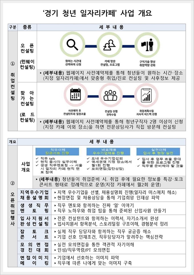 ºÎõ, ¾È¾ç, ¼ö¿ø µî û³â ¹ÐÁýÁö¿ªÀÇ Ä«Æä¿¡¼´Â ¡®¿ÀÇ ÄÁ¼³ÆÃ¡¯À» Áö¿øÇϰí Áö¿ª ¿ì¼ö±â¾÷ ä¿ë¼³¸íȸ, ÀâÅäÅ© ÄܼƮ, »ý»ý Á÷¹«¸àÅ丵, ÀÔ»çÁö¿ø¼ ¿Ï¼º ÄÁ¼³ÆÃ, ¸ðÀǸéÁ¢ °æÁø´ëȸ, ¸éÁ¢ À̹ÌÁö¸ÞÀÌÅ· µî ´Ù¾çÇÑ Ãë¾÷Áö¿ø ÇÁ·Î±×·¥¸¦ Áö¿øÇÒ °èȹÀÌ´Ù.