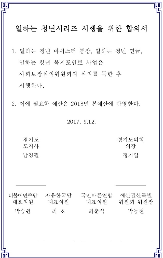 ³²°æÇÊ °æ±âµµÁö»ç¿Í Á¤±â¿ °æ±âµµÀÇȸ ÀÇÀå, ¹Ú½Â¿ø ´õºÒ¾î¹ÎÁÖ´ç ´ëÇ¥ÀÇ¿ø, ÃÖÈ£ ÀÚÀ¯Çѱ¹´ç ´ëÇ¥ÀÇ¿ø, ÃÖÃá½Ä ±¹¹Î¹Ù¸¥¿¬ÇÕ ´ëÇ¥ÀÇ¿ø, ¹Úµ¿Çö ¿¹»ê°á»êƯº°À§¿øÀåÀº 12ÀÏ ¿ÀÈÄ À̰°Àº ³»¿ëÀ» ´ãÀº ¡®ÀÏÇϴ û³â½Ã¸®Áî ½ÃÇàÀ» À§ÇÑ ÇÕÀǼ¡¯¿¡ ¼¸íÇß´Ù.