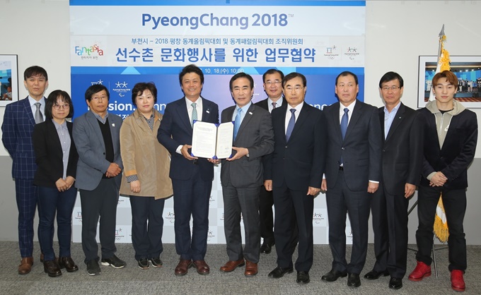 ±è¸¸¼ö ºÎõ½ÃÀå(¿ÞÂÊ)ÀÌ 18ÀÏ ¿ÀÀü 2018 Æòâ µ¿°è¿Ã¸²ÇÈÁ¶Á÷À§¿øÈ¸ ¿©Çü±¸ »ç¹«ÃÑÀå(¿À¸¥ÂÊ)°ú ¡®¼±¼öÃÌ ¹®È Çà»ç ¿î¿µÀ» À§ÇÑ ¾÷¹«Çù¾à¡¯À» ü°áÇÏ°í ±â³äÃÔ¿µÀ» Çϰí ÀÖ´Ù. 2017.10.18