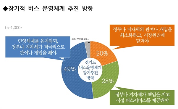 ¶ÇÇÑ Àå±âÀûÀÎ °æ±âµµÀÇ ¹ö½ºÃ¼°è ¿î¿µ¹æ½Ä¿¡ ´ëÇØ¼­´Â 49%°¡ ¡®¹Î¿µÃ¼Á¦¸¦ À¯ÁöÇϵÇ, Á¤ºÎ³ª ÁöÀÚü°¡ Àû±ØÀûÀ¸·Î °³ÀÔÇÏ´Â Áذø¿µ ¹æ½Ä¡¯À» ²Å¾Ò°í, 20%´Â ¡®½ÃÀå¿ø¸®¿¡ ¸Ã°Ü¾ß ÇÑ´Ù¡¯(¿ÏÀü ¹Î¿µ), 28%´Â ¡®ÁöÀÚü°¡ Á÷Á¢ ¹ö½º¼­ºñ½º¸¦ Á¦°øÇØ¾ß ÇÑ´Ù¡¯(¿ÏÀü °ø¿µ) ¼øÀ¸·Î Á¶»çµÆ´Ù.