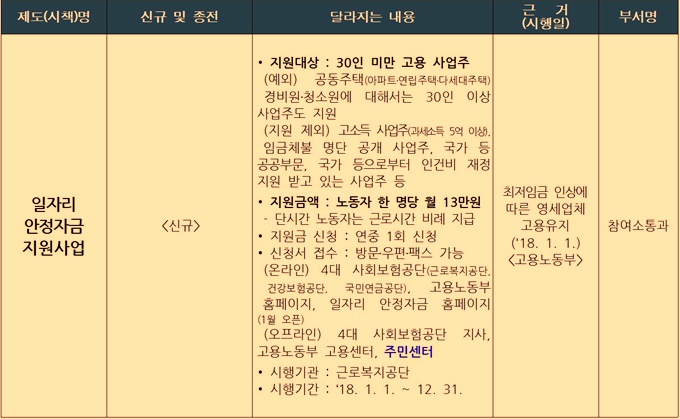 30ÀÎ ¹Ì¸¸ °í¿ë»ç¾÷ÁÖ¸¦ ´ë»óÀ¸·Î ÀÏÀÚ¸® ¾ÈÁ¤ÀÚ±ÝÀ» Áö¿øÇÑ´Ù. ¾ÆÆÄÆ® ¹× °øµ¿ÁÖÅà °æºñ¿ø¤ýû¼Ò¿ø¿¡ ´ëÇØ¼­´Â 30ÀÎ ÀÌ»ó »ç¾÷ÁÖµµ Áö¿ø °¡´ÉÇÏ´Ù. ´Ü, °í¼Òµæ »ç¾÷ÁÖ¿Í ÀÓ±ÝüºÒ ¸í´Ü°ø°³ »ç¾÷ÁÖ µîÀº Á¦¿ÜµÈ´Ù. Áö¿ø±Ý¾×Àº ³ëµ¿ÀÚ ÇÑ ¸í´ç ¿ù 13¸¸¿øÀ¸·Î ´Ü½Ã°£ ³ëµ¿ÀÚ´Â ±Ù·Î½Ã°£¿¡ ºñ·ÊÇØ Áö±ÞÇÑ´Ù.