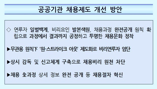 ±è¿ëÁø ±âȹÀçÁ¤ºÎ 2Â÷°üÀº ¡°¿À´Ã ¸»¾¸µå¸° ÈļÓÁ¶Ä¡ ¹× Á¦µµ°³¼± ¹æ¾ÈÀº °ø°ø±â°ü ä¿ëºñ¸® ±ÙÀýÀÇ ¸¶¹«¸®°¡ ¾Æ´Ñ °øÁ¤ÇÑ Ã¤¿ë¹®È­ Á¤ÂøÀ» À§ÇÑ Ã¹°ÉÀ½¡°À̶ó¸ç ¡±Á¤ºÎ´Â ¿À´Ã ¹ßÇ¥¸¦ °è±â·Î ä¿ëºñ¸®¿Í °°Àº ƯÇý¿Í ¹ÝÄ¢ÀÌ ¿ì¸®»çȸ¿¡ ´Ù½Ã´Â ¹ßºÙÀÌÁö ¸øÇϵµ·Ï ¸ðµç ³ë·ÂÀ» °æÁÖÇØ ³ª°¡°Ú´Ù¡°°í °­Á¶ÇÏ°í ¡±°ø°ø±â°üµéµµ Åõ¸í¼º°ú °øÁ¤¼ºÀ» °­È­ÇØ ÀÒ¾î¹ö¸° ±¹¹ÎÀÇ ½Å·Ú¸¦ ȸº¹ÇØ ³ª°¡´Â ÀüȯÁ¡ÀÌ µÇ±â¸¦ Èñ¸ÁÇÑ´Ù¡°°í ¹àÇû´Ù.