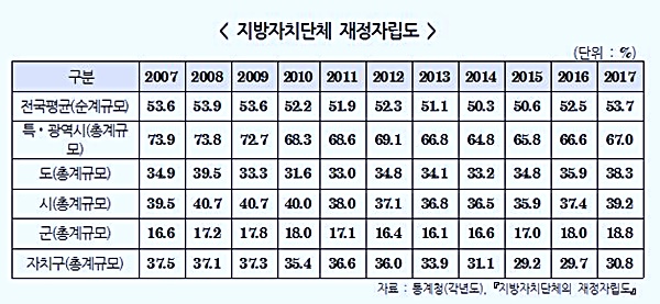 ¶ÇÇÑ Áö¹æÁ¤ºÎÀÇ ÀçÁ¤ÀÚ¸³µµµµ 2007³â 53.6%¿¡¼­ 2017³â¿¡´Â 53.7%·Î 10³â Àü°ú ºñ±³ÇØ ´ëµ¿¼ÒÀÌÇÑ ¼öÁØÀ̰í, ÀÌÁß Æ¯º°½Ã¿Í ±¤¿ª½ÃÀÇ °æ¿ì 2007³â 73.8%¿¡¼­ 2017³â 67%·Î °¨¼ÒÇÑ °ÍÀ¸·Î ³ªÅ¸³µ´Ù.
