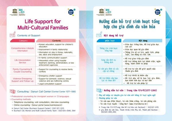 ½Ã ¹Î¿ø°ú °¡Á·°ü°èµî·ÏÆÀ¿¡ µû¸£¸é ¡®Á¾ÇÕ»ýȰÁö¿ø ¾È³»¹®¡¯¿¡´Â Çѱ¹¾î ±³À°»ç¾÷, ÀÚ³à Áö¿ø»ç¾÷, Åë¤ý¹ø¿ª¼­ºñ½º, Ãë¾÷Á¤º¸ Á¦°ø, °¡Á¤ Æø·Â µî¿¡ ÀÇÇÑ ÇÇÇØ¿©¼º Áö¿ø, ¹ý·ü»ó´ã Áö¿ø µî Çѱ¹ Á¤Âø¿¡ ÇÊ¿äÇÑ Á¤º¸¸¦ ´ã¾Ò´Ù.