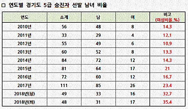 ÀÌÀç¸í °æ±âµµÁö»ç°¡ ¾ç¼ºÆòµîÀ» À§ÇØ °íÀ§Á÷ ¿©¼º°ø¹«¿ø°ú µµ³» °¢Á¾ À§¿øÈ¸ÀÇ ¿©¼º ºñÀ²À» ´Ã¸®°Ú´Ù°í ¾à¼ÓÇÑ °¡¿îµ¥, 7¿ù 31ÀÏ ¹ßÇ¥ÇÑ 5±Þ ½ÂÁø ¿¹Á¤ÀÚ °¡¿îµ¥ ¿©¼º ºñÀ²ÀÌ 35.4%·Î ¿ª´ë ÃÖ°í¸¦ ±â·ÏÇÑ °ÍÀ¸·Î ³ªÅ¸³µ´Ù.