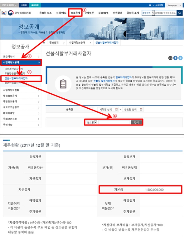 »óÁ¶¾÷üÀÇ ÀÚº»±Ý ±Ô¸ð, ¼±¼ö±Ý ¿¹Ä¡ºñÀ², À繫°ÇÀü¼º µîÀº °øÁ¤°Å·¡À§¿øÈ¸ ȨÆäÀÌÁö(www.ftc.go.kr¤ý¹Ù·Î °¡±â Ŭ¸¯)¿¡ Á¢¼ÓÇØ Á¤º¸°ø°³¡æ »ç¾÷ÀÚÁ¤º¸°ø°³¡æ ¼±ºÒ½Ä ÇҺΰŷ¡»ç¾÷ÀÚ Å¬¸¯¡æ ¡®»óÈ£¸í¡¯ °Ë»öâ¿¡ °¡ÀÔµÈ »óÁ¶¾÷ü °Ë»ö¡æ ¾÷ü ÀÚº»±Ý È®ÀÎ ¼øÀ¸·Î Á¶È¸°¡ °¡´ÉÇϸç, ±¸Ã¼ÀûÀÎ Á¶È¸ ¿ä·ÉÀº °æ±âµµ ¼ÒºñÀÚÁ¤º¸¼¾ÅÍ È¨ÆäÀÌÁö(www.gg.go.kr/gg_info_center¤ý¹Ù·Î °¡±â Ŭ¸¯)ÀÇ °øÁö»çÇ×À» ÅëÇØ È®ÀÎÇÒ ¼ö ÀÖ´Ù.