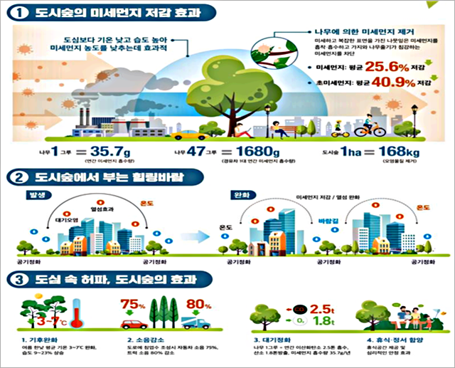 ³ª¹« 1±×·ç´Â ¿¬°£ 35.7gÀÇ ¹Ì¼¼¸ÕÁö¸¦ Èí¼öÇϸç, µµ½Ã ½£ 1ha°¡ Á¶¼ºµÉ °æ¿ì ¿¬°£ 168kg¿¡ ´ÞÇÏ´Â ¿À¿°¹°ÁúÀÌ Á¦°ÅµÇ´Â È¿°ú°¡ ÀÖ´Ù.