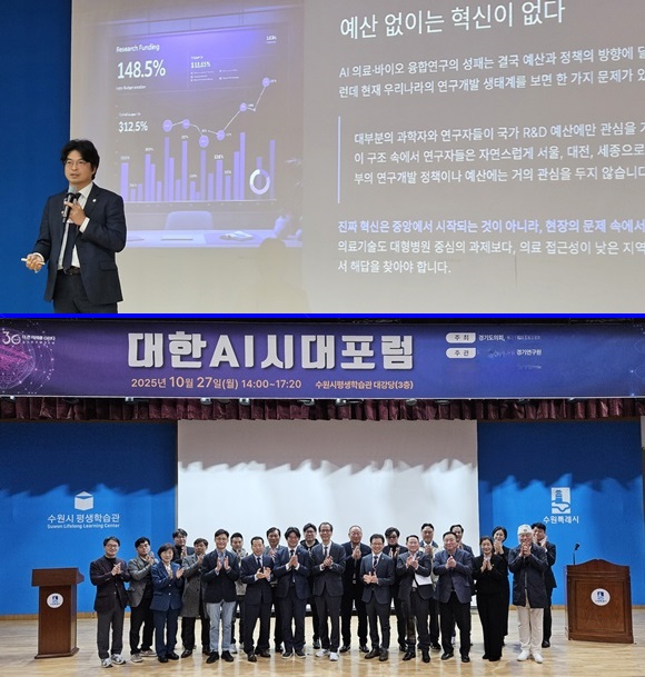 ¹Ú»óÇö °æ±âµµÀÇ¿ø(´õºÒ¾î¹ÎÁÖ´ç, ºÎõ8)ÀÌ 27ÀÏ ¼ö¿ø½ÃÆò»ýÇнÀ°ü ´ë°­´ç¿¡¼­ ¿­¸° ¡®´ëÇÑAI½Ã´ëÆ÷¡¯¿¡¼­ ÁÖÁ¦¹ßÇ¥ ¹× ÁÂÀåÀ» ¸Ã¾Æ ÀΰøÁö´É(AI) ´ëÀüȯ ½Ã´ë¿¡ ÇÊ¿äÇÑ »ç¶÷ Áß½ÉÀÇ Á¤Ã¥ ºñÀüÀ» Á¦½ÃÇß´Ù.