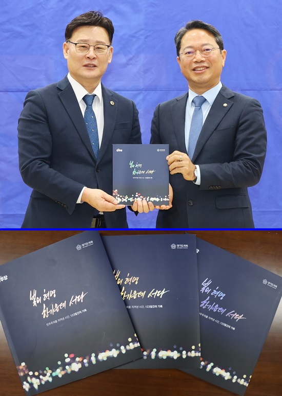 ÃÖÁ¾Çö °æ±âµµÀÇȸ ´õºÒ¾î¹ÎÁÖ´ç ´ëÇ¥ÀÇ¿ø(¿ÞÂÊ)ÀÌ ±è½Â¿ø ´õºÒ¾î¹ÎÁÖ´ç °æ±âµµ´ç À§¿øÀå(¿À¸¥ÂÊ)¿¡°Ô 12¡¤3 ºñ»ó°è¾ö ´ëÀÀ Ȱµ¿ ÀÚ·áÁý ¡®ºûÀÇ Çõ¸í ÇѰ¡¿îµ¥ ¼­´Ù¡¯¸¦ Àü´ÞÇÏ°í ±â³äÃÔ¿µÀ» Çϰí ÀÖ´Ù.(»çÁø= °æ±âµµÀÇȸ Á¦°ø)