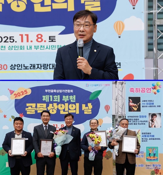 ±èº´Àü ºÎõ½ÃÀÇȸ ÀÇÀåÀÌ Áö³­ 8ÀÏ ½É°îº¹°³Ãµ »óÁ¡°¡ ÀÏ´ë¿¡¼­ ¿­¸° ¡®Á¦1ȸ ºÎõ °ñ¸ñ»óÀÎÀÇ ³¯¡¯ Çà»ç¿¡¼­ Ãà»ç¸¦ Çϰí ÀÖ´Ù. ¾Æ·¡´Â ¸ð¹ü »óÀο¡°Ô ÀÇÀå»óÀ» ¼ö¿©ÇÏ°í ±â³äÃÔ¿µÀ» ÇÏ´Â ¸ð½À.(»çÁø= ºÎõ½ÃÀÇȸ Á¦°ø)