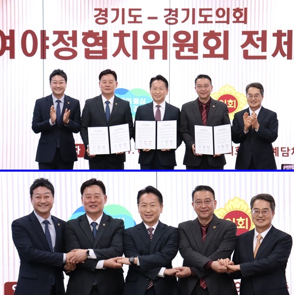 °æ±âµµÀÇȸ ¿©¾ß, °æ±âµµ µî 3ÀÚ ¿©¾ßÁ¤ ÇùÄ¡À§¿øÈ¸°¡ 4ÀÏ °æ±âµµÀÇȸ ¿¹´ãä¿¡¼­ 2026³Æµµ ÇùÄ¡ ¿¹»ê¿¡ ÇÕÀÇ µÚ ¼ÕÀ» ¸ÂÀâ°í ±â³äÃÔ¿µÀ» Çϰí ÀÖ´Ù.(»çÁø= °æ±âµµÀÇȸ Á¦°ø)