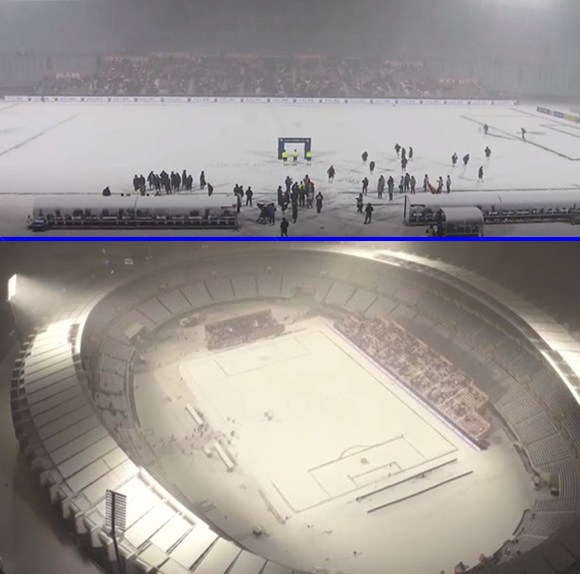 4ÀÏ Àú³á Æø¼³ÀÌ ³»¸®¸é¼­ ºÎõÁ¾ÇտÀå ±×¶ó¿îµå¿¡ ´«ÀÌ ÇϾé°Ô ½×¿© ÀÖ´Ù. ÀÌ·Î ÀÎÇØ À̳¯ ¿ÀÈÄ 7½Ã ¿­¸± ¿¹Á¤ÀÌ´ø ºÎõFC¿Í ¼ö¿øFCÀÇ ½Â°­ Ç÷¹ÀÌ¿ÀÇÁ 1Â÷ÀüÀº ¿¡ °æ±â ½ÃÀÛ Á÷Àü Ãë¼ÒµÆ´Ù.(»çÁø= ¹æ¼ÛÈ­¸é ĸó °¥¹«¸®)