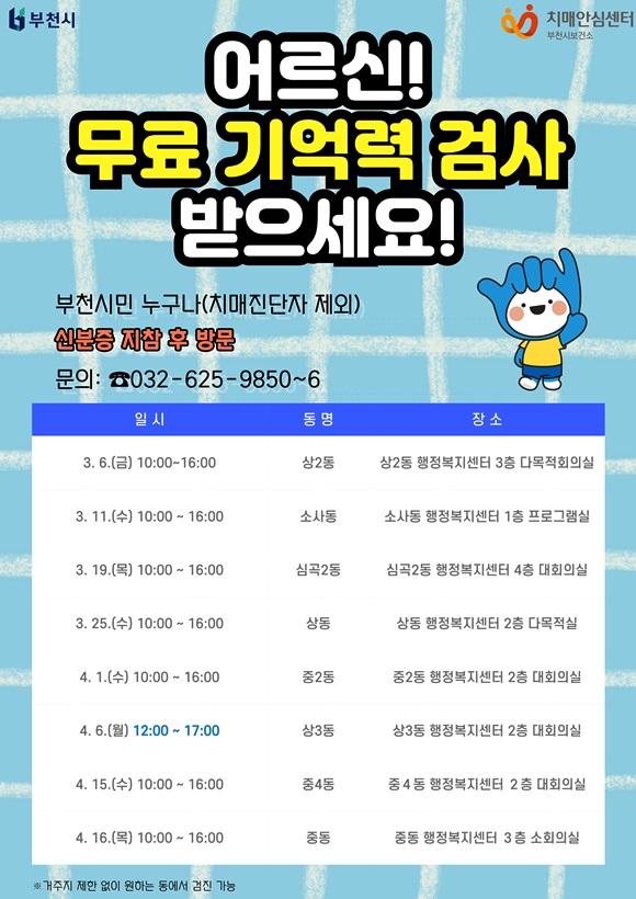 ¼¼ºÎ ÀÏÁ¤Àº ºÎõ½Ãº¸°Ç¼Ò ȨÆäÀÌÁö(pubhealth.bucheon.go.kr¤ý¹Ù·Î °¡±â Ŭ¸¯)¿¡¼­ È®ÀÎÇÒ ¼ö ÀÖÀ¸¸ç, Ä¡¸Å¾È½É¼¾ÅÍ µî·Ï ´ë»óÀÚ¿¡°Ô´Â °³º° ¹®ÀÚ ¾È³»¸¦ ÅëÇØ °ËÁø ÀÏÁ¤°ú Àå¼Ò¸¦ ¾È³»ÇÒ ¿¹Á¤ÀÌ´Ù.