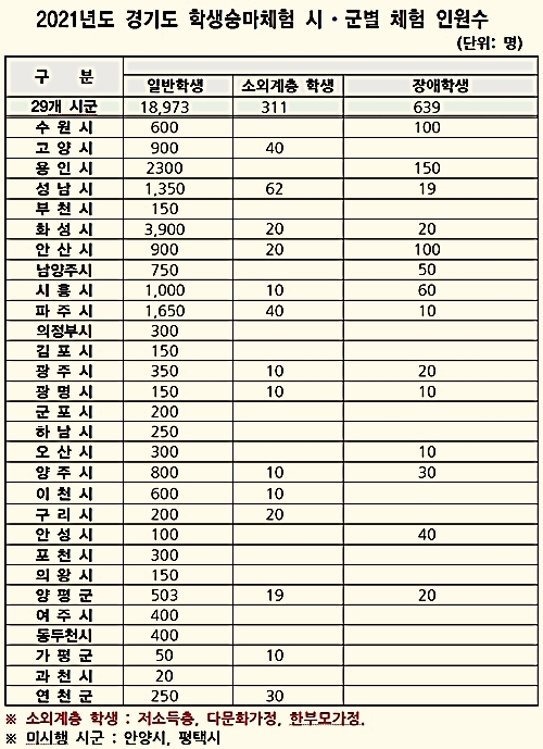 ¿ÃÇØ´Â µµ³» ÃʤýÁߤý°í»ý 1¸¸8õ973¸íÀ» ´ë»óÀ¸·Î ¡®Çлý ½Â¸¶Ã¼Çè ÇÁ·Î±×·¥¡¯À» ¿î¿µÇÒ °èȹÀ¸·Î, ½Â¸¶ üÇèºñ ÃÑ 32¸¸¿ø Áß 70%(22¸¸4õ¿ø)¸¦ Á¤ºÎ¿Í ÁöÀÚü°¡ ºÎ´ãÇϰí ÇлýÀº ³ª¸ÓÁö 30%(9¸¸6õ¿ø)¸¸ ºÎ´ãÇÏ¸é µÈ´Ù.