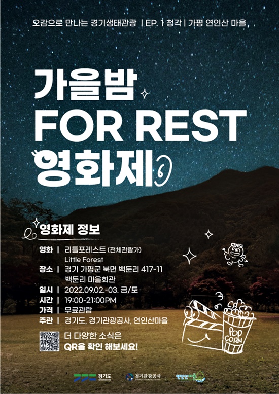 °æ±âµµ¿Í °æ±â°ü±¤°ø»ç´Â 9¿ù 2Àϰú 3ÀÏ °æ±âµµ »ýŰü±¤°ÅÁ¡ÀÎ °¡Æò±º ¿¬ÀÎ»ê ¸¶À»¿¡¼ ¹«·á ¿µÈ »ó¿µÀ» ÇÏ°í °æÇ°À» Á¦°øÇÏ´Â ¡®FOR REST(Æ÷·¹½ºÆ®) ¿µÈÁ¦¡¯¸¦ °³ÃÖÇÑ´Ù.