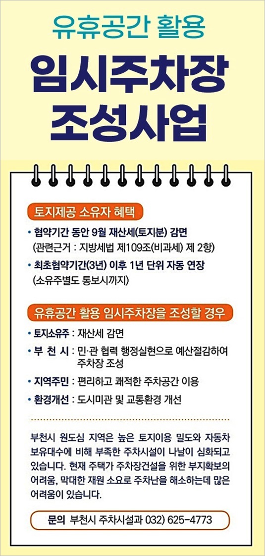 ºÎõ½Ã´Â À¯ÈÞºÎÁö¸¦ Ȱ¿ëÇÑ ÀÓ½ÃÁÖÂ÷Àå Á¶¼º»ç¾÷À» ÃßÁøÇØ ¿øµµ½É ÁÖÂ÷³ ÇØ¼Ò ¹× ¿¹»ê Àý°¨ÀÇ È¿°ú¸¦ °ÅµÎ°í ÀÖ´Ù.