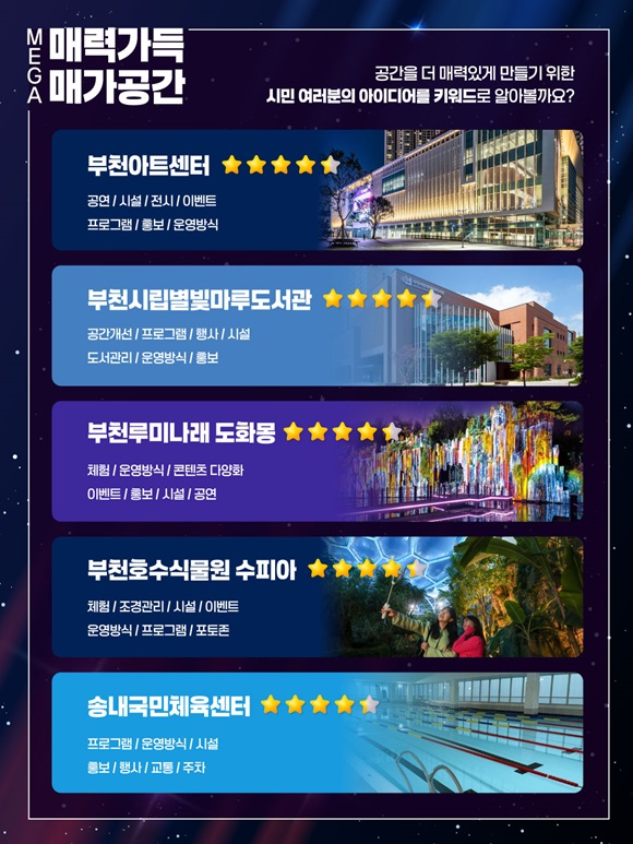 ¡®¸Å°¡(MEGA) °ø°£¡¯Àº ºÎõ½Ã Á¤Ã¥Á¦¾È ¿Â¶óÀÎ Ç÷§Æû ¡®ºÎõ, Á¦¾ÈÇڽ硯(¹Ù·Î °¡±â Ŭ¸¯)À» ÅëÇØ °ø¸ðÇÑ ½Ã¹Î Á¦¾È ÀÇÁ¦·Î, ¡®ºÎõÀ» ´õ Å©°Ô! ´õ ¸Å·Â ÀÖ°Ô!¡¯¶ó´Â ½½·Î°Ç ¾Æ·¡ ½Ã¹ÎÀÌ Á÷Á¢ °ø°ø °ø°£ÀÇ ¸Å·ÂÀ» Æò°¡ÇÏ´Â Âü¿©Çü ÇÁ·ÎÁ§Æ®´Ù.