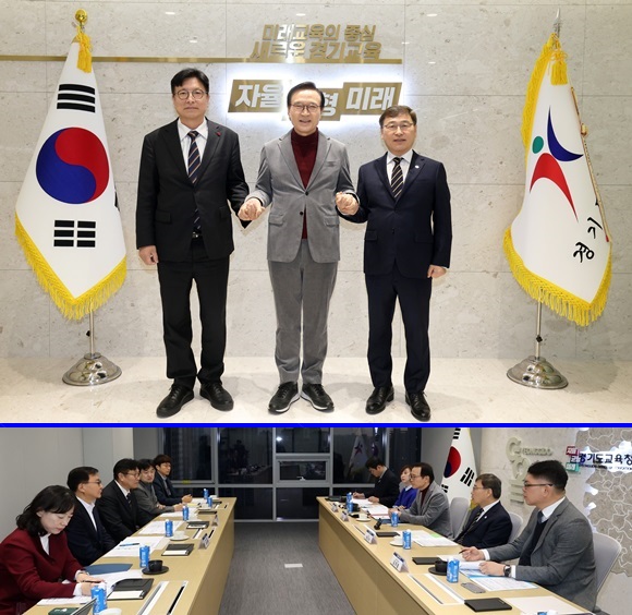ÀÓÅÂÈñ °æ±âµµ±³À°°¨(°¡¿îµ¥)ÀÌ 8ÀÏ ¿ÀÀü °æ±âµµ±³À°Ã»¿¡¼­ ¿­¸° 2026³â Á¦1ȸ ¼öµµ±Ç±³À°°¨ÇùÀÇȸ¿¡¼­ Âü¼®ÇØ Á¤±Ù½Ä ¼­¿ï±³À°°¨(¿À¸¥ÂÊ), µµ¼ºÈÆ ÀÎõ±³À°°¨(¿ÞÂÊ)°ú ±â³äÃÔ¿µÀ» Çϰí ÀÖ´Ù.(»çÁø= °æ±âµµ±³À°Ã» Á¦°ø)