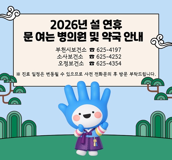 ¼³ ¿¬ÈÞ ±â°£ ¿î¿µ ÀÇ·á±â°ü°ú ¾à±¹ Á¤º¸´Â ÀÎÅÍ³Ý °Ë»öâ¿¡ ¡®¸íÀý º´¿ø¡¯ ¶Ç´Â ¡®¸íÀý Áø·á¡¯¸¦ ÀÔ·ÂÇϰųª ½º¸¶Æ®Æù ¾Û ¡®E-gen¡¯, ¡®ÀÀ±Þ¶È¶È¡¯À» ÅëÇØ È®ÀÎÇÒ ¼ö ÀÖÀ¸¸ç, ÀÀ±ÞÀÇ·áÆ÷Åаú ºÎõ½Ã ȨÆäÀÌÁö(bucheon.go.kr¤ý¹Ù·Î °¡±â Ŭ¸¯), ºÎõ½Ãº¸°Ç¼Ò ȨÆäÀÌÁö(pubhealth.bucheon.go.kr¤ý¹Ù·Î °¡±â Ŭ¸¯)¿¡¼­µµ ¾È³»ÇÑ´Ù.