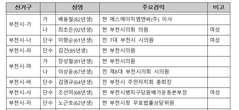 ¡ÜºÎõ½Ã °¡¼±°Å±¸ (¿ø¹Ì1µ¿, ¿ª°î1µ¿, ¿ª°î2µ¿, ÃáÀǵ¿, µµ´çµ¿)= º¹¼ö °øÃµ. ¡ã°¡¹ø ¹è¿ëö(1982³â»ý¤ý43¤ýÇö ºÎõºÏ°íµîÇб³ Ãѵ¿¹®È¸ »ç¹«±¹Àå¤ý¾Ö½º¿¡ÀÌÄ¡¿¥¾Ø¾¾¢ß ÀÌ»ç). ¡ã³ª¹ø ÃÖÃÊÀº(1992³â»ý¤ý33¤ýÇö ºÎõ½ÃÀÇ¿ø/À±¸®Æ¯º°À§¿øÈ¸ ºÎÀ§¿øÀå¤ýÇö ±¹¹ÎÀÇÈû °æ±âµµ´ç ´ëº¯ÀÎ).